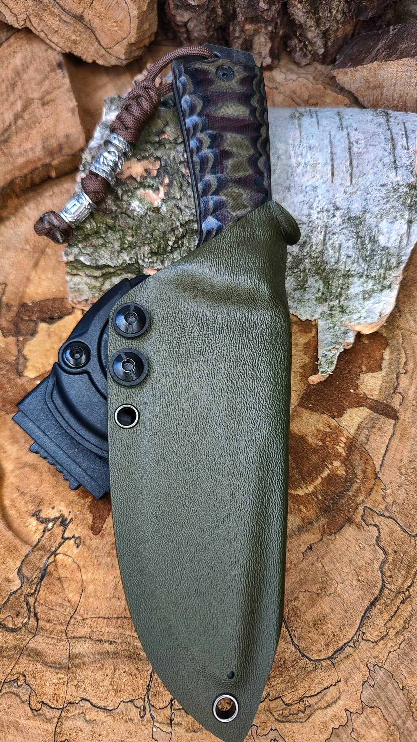 - POCHWA: Kydex oliwka z mocowaniem Tek-lock 360° (możliwość wymiany na inny system)