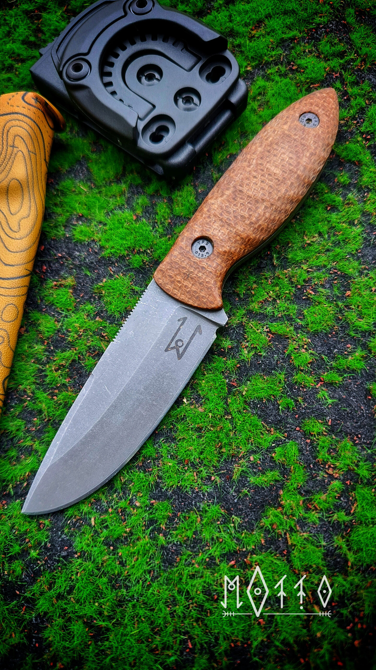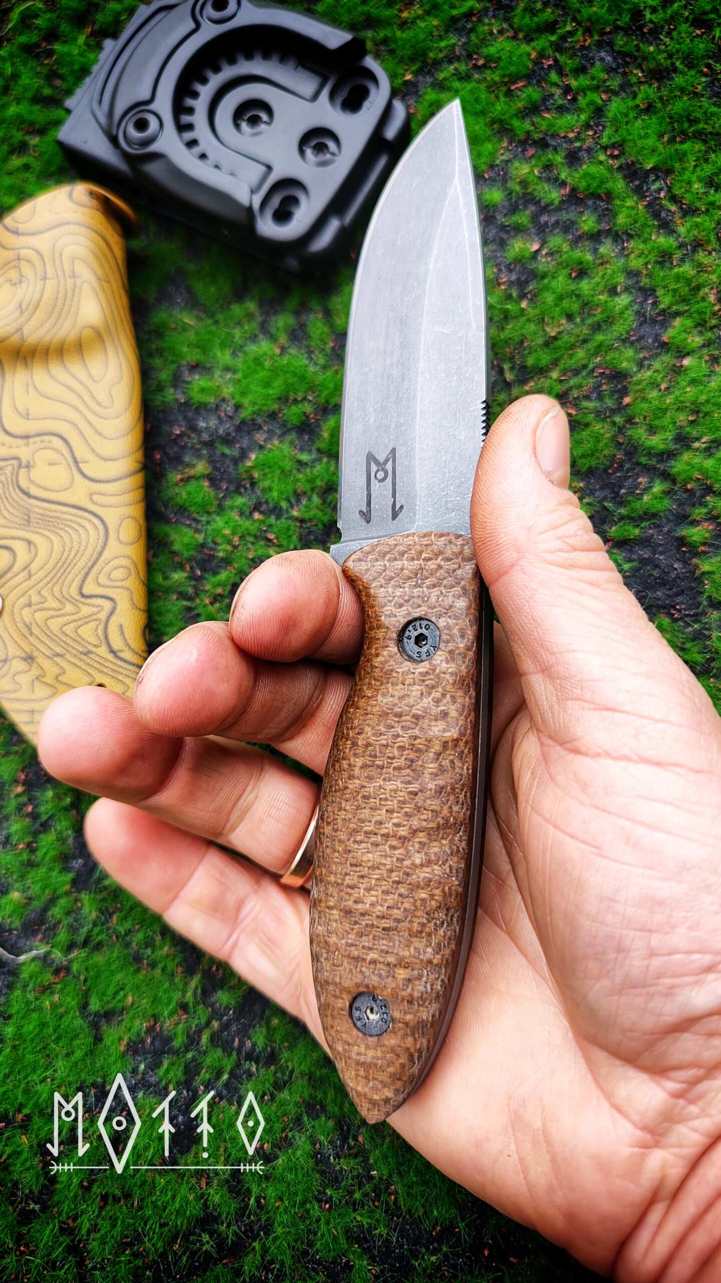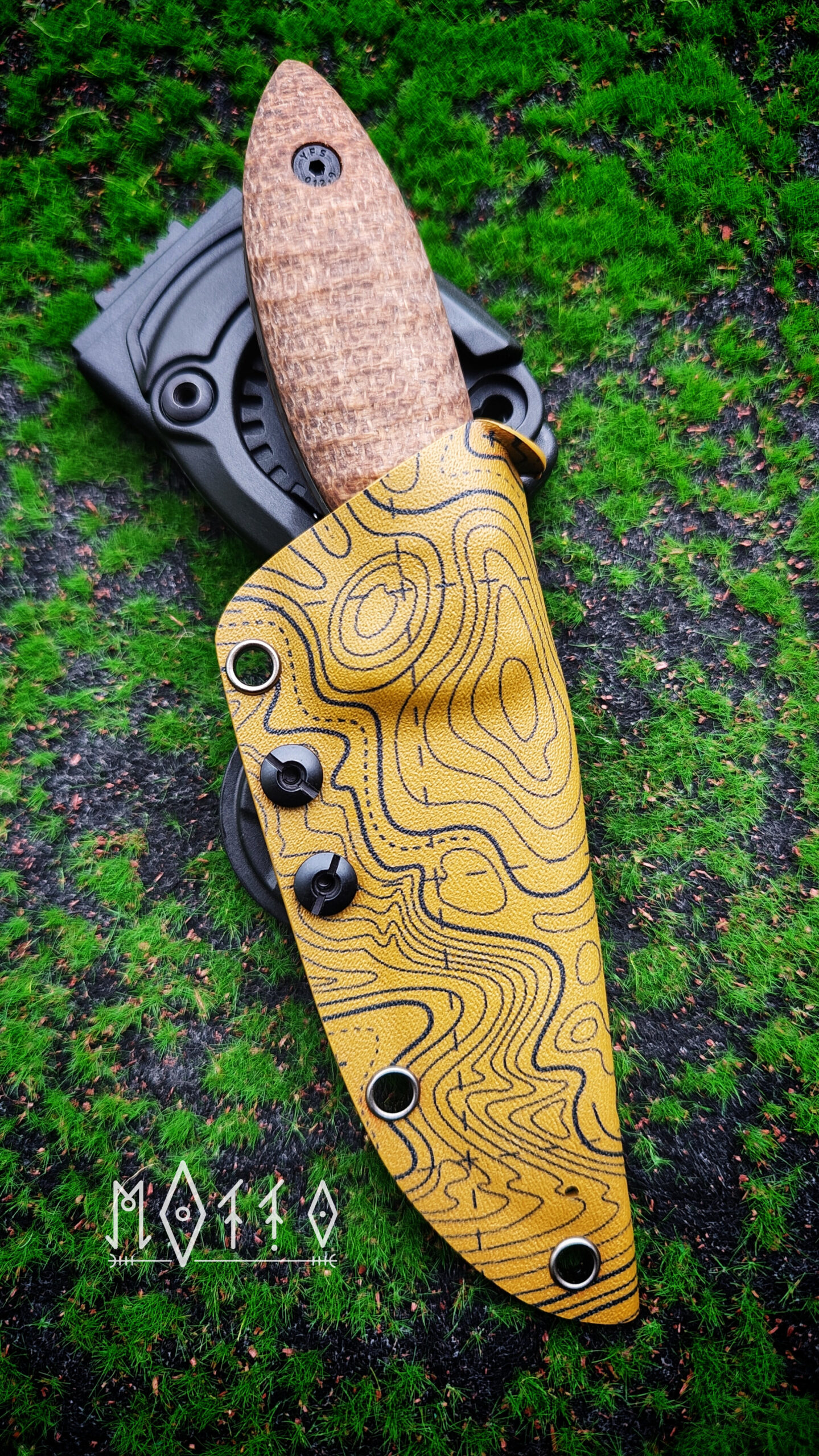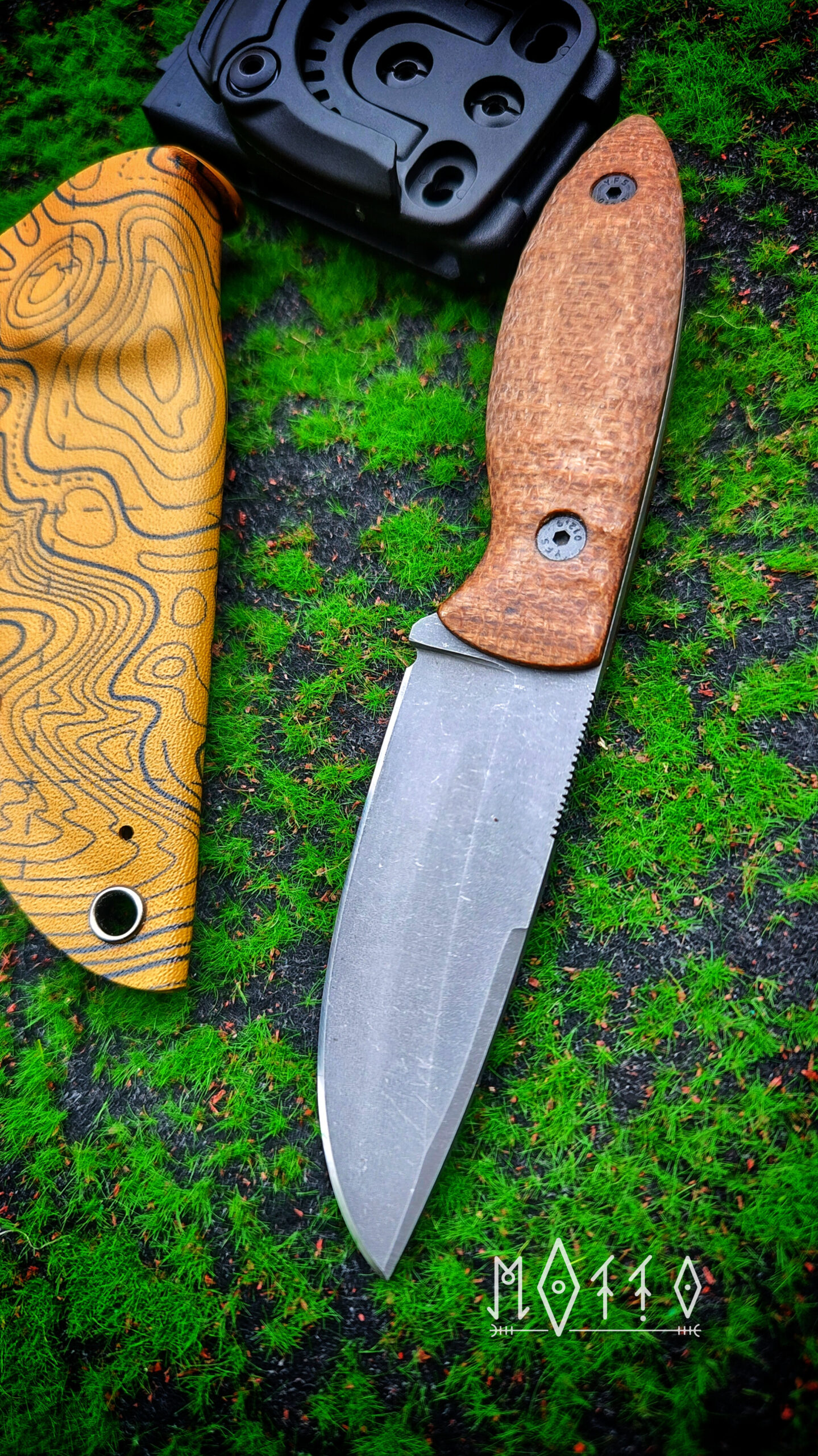 Całość uzupełnia pochwa z kydexu ze wzorem topograficznej mapy, która dobrze wpisuje się w terenowy charakter zestawu. Montaż w systemie 360° pozwala ustawić nóż dokładnie pod siebie.